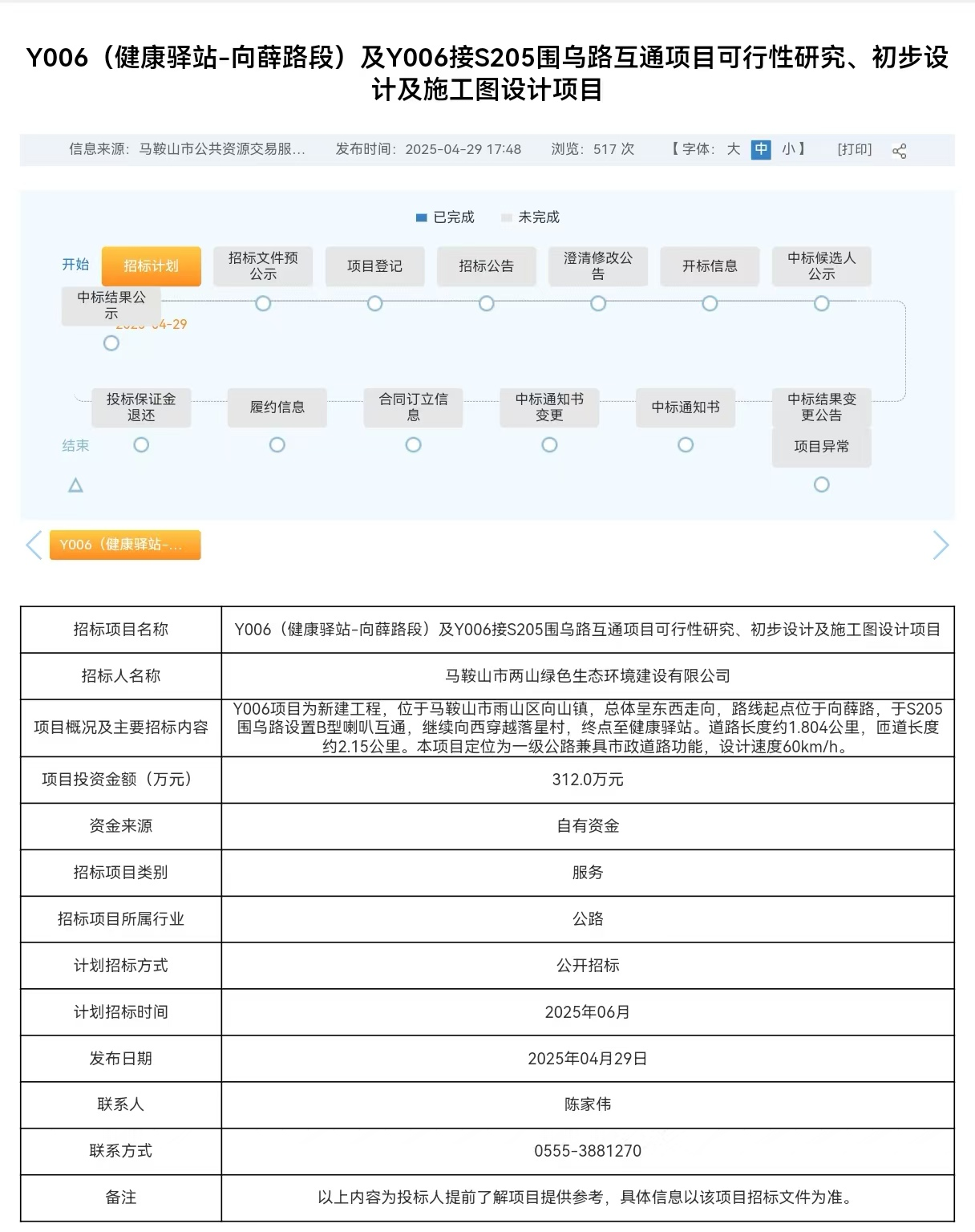 2025年4月29日,马鞍山市公共资源交易服务中心发布Y006(健康驿站-向薛路段)及Y006接S205围乌路互通项目可行性研究、初步设计及施工图设计项目招标计划,标志该项目正式进入实质性实施阶段。
